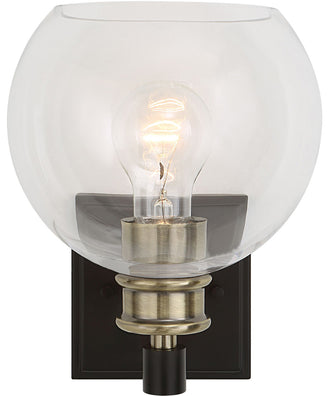Timeless lines make this 1 lt. sconce an understated classic. finished in a combination of matte black & plated antique brass then topped with sparkling clear round glass shade. 1-60 watt max, edison socket. bulbs not included.