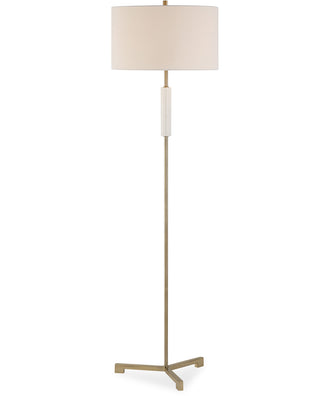 This contemporary floor lamp is simple in design. The metal body is finished in an antique brass and is adorned with a piece of white marble, adding a touch of elegance. The shade is a round hardback in off-white linen.