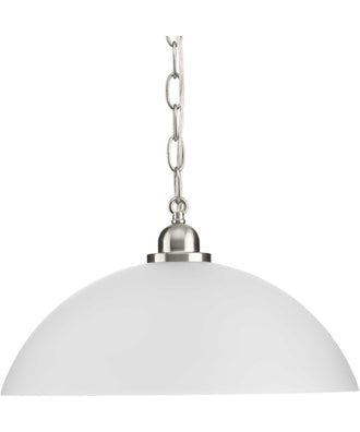 Classic Dome pendant delivers beautiful down light to surfaces in kitchens and breakfast nooks. The elegantly simple design of the dome pendant complements transitional and traditional decor styles. Finished in soft brushed nickel with an etched glass shade. This sophisticated, versatile pendant can be displayed singularly or in groupings of two or more - such as foyers, entryways, kitchens. Uses (1) 100-Watt maximum, medium base bulbs or LED equivalent, that is sold separately, and dimmable when used in conjunction with a dimmable bulb. Measures 15- in. diameter by 8.125-in. height. Includes 36 in. of chain for a variety of ceiling heights and can be used on a sloped ceiling. Warranty: Our 1-Year Limited Warranty guarantees your complete satisfaction with your purchase and includes professional after-sales customer service support. Includes installation instructions and mounting hardware for a quick, easy installation. Progress Lighting products are designed for exceptional quality, reliability, and functionality
