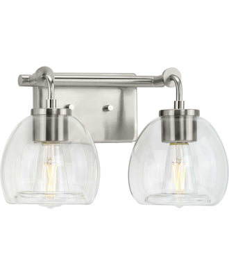 Ideal for a bathroom or powder room. Perfect for urban industrial, farmhouse, and rustic style settings. Beautiful brushed nickel finish. Bell-shaped clear glass. Mount the light fixture facing up or down. Uses 2 medium base base bulbs that are sold separately (60 W max - LED/CFL/incandescent). Measures 8-87/100-inch height by 14-31/50 length by 7-1/2-inch width (extends from wall). Certifications: cULus Damp Location Listed. Pairs with the Cirro and Zin collections by Progress Lighting. Our 1-year Limited Warranty guarantees your complete satisfaction with your purchase and includes professional after-sales customer service