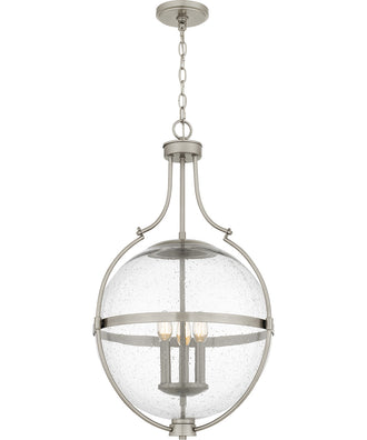 The Quoizel Pendant Large 3-light Pendant in Brushed Nickel is a stunning addition to any home, blending transitional flair with modern sophistication. Its design features a clear seedy glass globe that encapsulates the light, creating a mesmerizing visual effect. The exposed bulb sockets and sleek metal lines further enhance its contemporary appeal, making it a statement piece in any room.