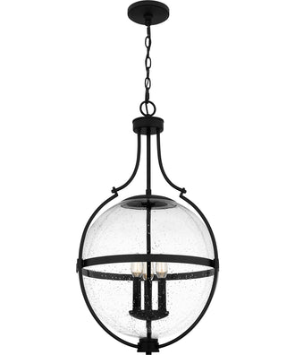 Elevate your home decor with the Quoizel Pendant Large 3-light Pendant in Matte Black. This exquisite lighting fixture features a sophisticated design that blends transitional flair with modern elegance. The pendant showcases a clear seedy glass globe, adding a touch of sophistication and contemporary style to any space. The exposed bulb sockets and sleek metal lines create a striking visual contrast, making this pendant light a statement piece in any room.
