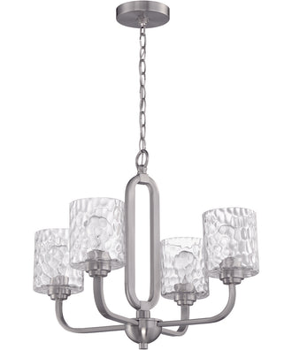 The Collins 4-Light Chandelier in Brushed Polished Nickel by Craftmade is a masterpiece of modern elegance and sophistication. This chandelier features graceful geometric elements that playfully capture the clear hammered glass shades, delivering a warm, welcoming wash of light. The brushed polished nickel finish adds a touch of contemporary style, making it a perfect addition to any modern or transitional decor.