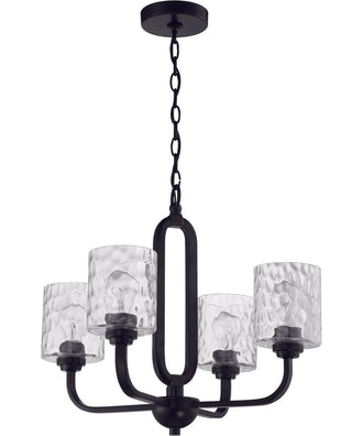 The Collins 4-Light Chandelier in Flat Black by Craftmade is a stunning addition to any home, offering a blend of modern elegance and timeless charm. Its graceful geometric elements are beautifully crafted to create a sophisticated look that effortlessly captures attention. The chandelier features four clear hammered glass shades that add texture and visual interest, making it a perfect focal point for any room.