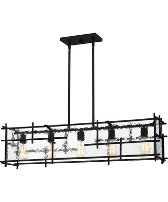 Elevate your home’s aesthetic with the Daphne Medium 5-light Island Light in Matte Black. This stunning fixture combines transitional design elements with industrial flair, making it a versatile and stylish addition to any space. The open rectangular silhouette is crafted from durable steel and features staggered matte black lines that frame clear ice glass panels, creating a striking contrast that draws the eye.
