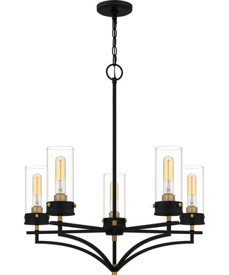 The Hillside 5-light Chandelier in Matte Black is a stunning embodiment of modern industrial style. Its sleek, thin arms are finished in a sophisticated matte black, creating a striking contrast with the clear glass shades and warm brass accents. This blend of materials and finishes brings a touch of elegance to its clean lines and geometric silhouette, making it a versatile piece that can enhance various home décor styles.