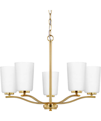 The Adley Collection chandelier is a simple, elegant fixture that is perfect over dining rooms, halls and home theaters or bedrooms. The light's form is fundamentally modern but with a traditional twist, making it ideal for transitional and contemporary interiors. The chandelier is coated in a sophisticated satin brass finish. The clean design combines etched white glass shades with a curved arms and simple, straight bars. Uses (5) 60-Watt maximum, medium base bulbs or LED equivalent, that is sold separately, and dimmable when used in conjunction with a dimmable bulb. Measures 22.87-in. diameter by 17.25-in. height. Includes 48 in. of chain for a variety of ceiling heights and can be used on a sloped ceiling. Warranty: Our 1-Year Limited Warranty guarantees your complete satisfaction with your purchase and includes professional after-sales customer service support. Includes installation instructions and mounting hardware for a quick, easy installation. Progress Lighting products are designed for exceptional quality, reliability, and functionality