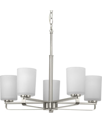 APPLICATION: Distinguish your home with clean modern design with the League Collection Five-Light Brushed Nickel and Etched Glass Contemporary Chandelier Light ideal for any dining room, kitchen, foyer, entryway, or living room. STYLES: Perfect for modern farmhouse and contemporary style settings. FINISH: The gracefully extended arms and sleek frame are coated in a beautiful brushed nickel finish to create a modern aesthetic. MATERIALS: Constructed from steel to ensure a long product lifespan. GLASS/SHADES: Classic etched glass shades emphasize the contrast between soft and clean. BULBS: For ideal illumination, use 5 medium base bulbs that are sold separately (100 W max - LED/CFL/incandescent). Compatible with dimmable bulbs. DIMENSIONS: Measures 24 in length by 18.62 in height by 24 in width. CERTIFICATIONS: Dry Location Listed. PAIRS WITH: We recommend curating lighting designs to create a home that suits your individual style. Consider pairing League with any of the following collections by Progress Lighting: Tobin, Milner, or Hartwick. WARRANTY: Our 1-year Limited Warranty guarantees your complete satisfaction with your purchase and includes professional after-sales customer service support.