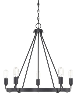 The Tanner 5-Light Chandelier in Matte Black is a striking addition to any home, offering a blend of modern sophistication and timeless elegance. Its sleek, matte black finish provides a contemporary touch that complements various interior styles, from industrial to minimalist and modern farmhouse. The chandelier's design features a circular frame with five upward-facing lights, creating a balanced and symmetrical look that draws the eye and enhances the room's ambiance.