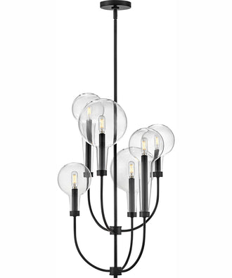 The Alchemy 6-Light Medium Multi Tier chandelier in Black by Hinkley is a stunning addition to any space. This exquisite light fixture features a sleek black finish that exudes sophistication and modernity. The chandelier's design showcases six gracefully curved arms, each holding a clear glass globe that encases the bulbs, creating a visually striking multi-tiered effect. The transparent globes add a touch of elegance and allow the light to diffuse beautifully, casting a warm and inviting glow throughout the room.