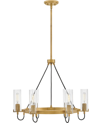 The Ryden 6-Light Medium Chandelier in Heritage Brass is a versatile stunner that brings a touch of sophistication to any room. Its elongated, clear glass shades envelop the bulbs, creating a captivating display of light. The chandelier is held by heavy cast prongs and features ribbed details that add texture and depth to its design. The black, fabric-wrapped cords perfectly complement the Heritage Brass finish, making this chandelier a striking addition to your decor.