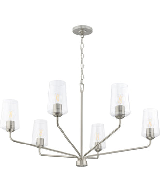 The Celino chandelier is characterized by its expansive, polished metal arms finished in a subtle Brushed Nickel. These arms curve upwards elegantly, cradling the clear glass shades with a gentle embrace. The brushed nickel finish adds a touch of sophistication and modernity, ensuring that this chandelier complements a variety of interior styles, from updated traditional to transitional settings.