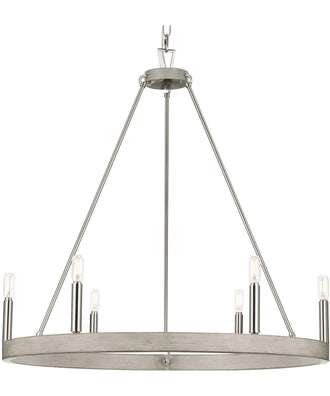 The Galloway 6-Light Modern Farmhouse Chandelier is a stunning blend of clean, modern lines and rustic charm. This chandelier features a circular frame with a lightly distressed grey washed oak finish, creating a perfect balance between contemporary and farmhouse aesthetics. The brushed nickel accents add a touch of sophistication, making it a versatile piece that complements various interior styles, including modern mountain and coastal themes.