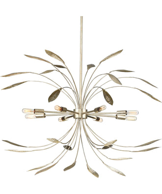 The Mariposa 8-Light Hanging Pendant Light in Gilded Silver is a stunning centerpiece that brings a touch of nature-inspired elegance to any room. The design features slender branches that bloom outward from the central stem, each adorned with delicate leaves coated in a luxurious gilded silver finish. This organic yet sophisticated look is balanced by minimalist lines, creating a versatile piece that complements both contemporary and transitional style settings.