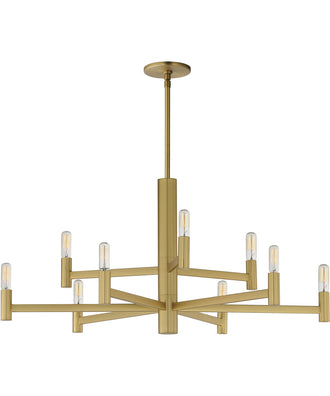 Transform your living space with the Emana 9-Light Chandelier in Natural Aged Brass. This stunning chandelier combines modern design with timeless elegance, making it a perfect centerpiece for any room. The chandelier features straight extensions of rectilinear arms emanating from a cylindrical center housing, creating a sleek and streamlined look that complements various interior styles.