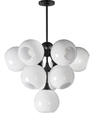 The Neve 10-Light Pendant in Black is a striking piece that effortlessly combines elegance and modernity. Featuring a swirling white Marble Glass globe that encases each light source, the design is reminiscent of snowglobes, creating a wonderfully wintery composition. The matte black finish adds a touch of sophistication, making it a timeless addition to any space.