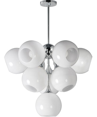 The Neve 10-Light Pendant in Polished Chrome is a masterpiece of modern lighting design. Featuring a stunning array of swirling white Marble Glass globes, this pendant light evokes the timeless elegance of snowglobes, creating a wintery composition that is both sophisticated and enchanting. The polished chrome finish adds a touch of contemporary flair, making it a versatile piece that can complement various interior styles.