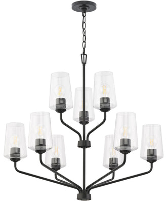 Crafted with exceptional quality, the Celino chandelier boasts a sturdy steel construction and a painted black finish. The nine perfectly proportioned clear glass shades are layered in two tiers, delivering bright light to the surrounding space. Measuring 32 inches in diameter and 29.5 inches in height, this chandelier is both substantial and striking. It uses nine 60-watt max medium base bulbs or LED equivalents, which are sold separately, and is dimmable when used in conjunction with dimmable bulbs. The chandelier is dry location listed for indoor use only and comes with a 1-year limited warranty, guaranteeing your complete satisfaction with your purchase.