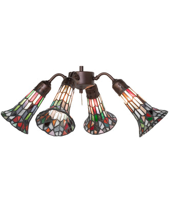 Inspired by the famous Tiffany design from the early 1900s. This fan light fixture features 4 stunning shades created of Multicolored art glass using the famous Meyda Tiffany copperfoil construction technique. An elegant cast metal hub embraces the Lily shades with a floral-styled fitter finished by hand in Mahogany Bronze. The Tiffany Pond Lily 4 Light Fan Light is included in our American-designed; handcrafted Stained Glass Lighting Collection. UL and cUL listed for dry and damp locations. Each shade is a unique work of art with color variations based on natural ingredients inherent in the glass. Please contact us if color matching is critical when ordering multiple items. Fan not included.
