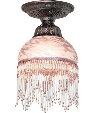A charming nostalgic flushmount that is perfect for nearly any room. This Roussillon features a stunning Cranberry Mottled Art Glass shade color coordinated with delicate Cranberry; Pearlescent Beige; and Clear glass beaded fringe. Elegant cast metal hardware in a Mahogany Bronze finish embraces this Victorian-inspired shade. This flushmount is perfect for placing in hallways and living spaces in fine Victorian homes from Pawtucket; Rhode Island; to Pittsburgh; Pennsylvania; to Albuquerque; New Mexico. The Roussillon Flushmount is featured in our American-designed; handcrafted Boudoir Lighting Collection. UL and cUL listed for dry and damp locations. Each shade is a unique work of art with color variations based on natural ingredients inherent in the glass. Contact us if color matching is critical when ordering multiple items of the same size or shade.