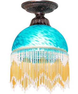 A charming nostalgic flushmount that is perfect for nearly any room. This Roussillon features a stunning Teal Mottled Art Glass shade color coordinated with delicate Amber; Pearlescent Beige and Clear glass beaded fringe. Elegant cast metal hardware in a Mahogany Bronze finish embraces this Victorian-inspired shade. This flushmount is perfect for placing in hallways and living spaces in fine Victorian homes from Pawtucket; Rhode Island; to Pittsburgh; Pennsylvania; to Albuquerque; New Mexico. The Roussillon Flushmount is featured in our American-designed; handcrafted Boudoir Lighting Collection. UL and cUL listed for dry and damp locations. Each shade is a unique work of art with color variations based on natural ingredients inherent in the glass.