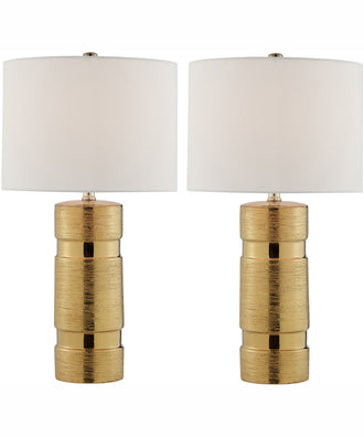 Introducing the Lucano 2-Light Table Lamp set, a perfect blend of sophistication and modern design. These lamps feature a striking gold finish that exudes luxury and elegance. The cylindrical ceramic base is adorned with a textured pattern, adding a touch of artistry and refinement to any space. Topped with a pristine white linen shade, these lamps offer a timeless appeal that complements various interior styles.