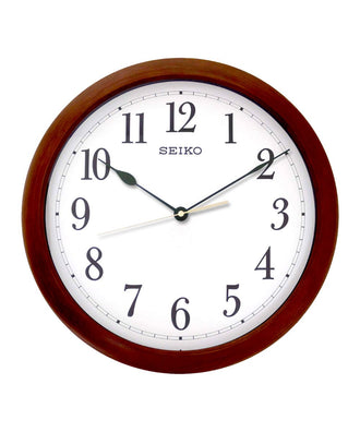 • Classically designed, it features a brown case with a wood grain finish, crystal glass, and a quiet sweep second hand.