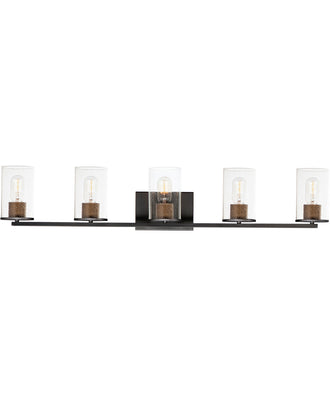 The Sleek 5-Light Bath Vanity in Antique Brass and Black is a stunning addition to any modern bathroom. This fixture features a minimalist design with clean lines, making it an ideal choice for those who appreciate contemporary aesthetics. The combination of matte black frames and antique brass socket covers creates a striking contrast that adds a touch of sophistication to your space. The clear seedy glass cylinders provide a unique texture, enhancing the overall visual appeal of the vanity light.