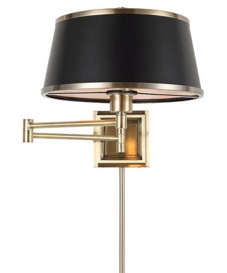 Our newmarket sconce provides a classic feel with a traditional profile. the tapered black faux leather shade has top & bottom antique brass finish accent rings is, affixed to an antique brass finish frame, and can swing left or right. includes dual mount option with 8' of wire & plug, in-line dimmer switch, and 3-12" metal cord covers for easy plug in installation or it can be wired directly to an outlet box as a sconce. 1-60 watt max, edison socket. bulb not included.