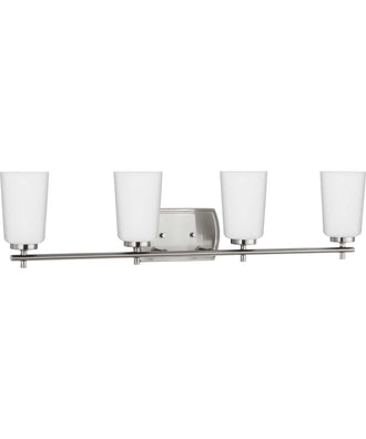 Add beautiful illumination to bathrooms, vanities and powder rooms with the Adley Collection Vanity Light. This vanity light will find a home in any traditional, new traditional or transitional style setting. Finished in a subtly reflective brushed nickel for an elegant texture. The light source is surrounded by an etched opal glass shade for gorgeous illumination. Mount the light fixture with the glass facing up or down for more design flexibility. Uses (4) 60-Watt maximum, medium base bulbs or LED equivalent, that is sold separately, and dimmable when used in conjunction with a dimmable bulb. Measures 32-inch width by 7.625-inch height by 6-inch (extends from wall). Certifications: cULus Damp Location listed, fixture can be used in rooms where moisture may be present. Warranty: Our 1-Year Limited Warranty guarantees your complete satisfaction with your purchase and includes professional after-sales customer service support. Includes installation instructions and mounting hardware for a quick, easy installation. Progress Lighting products are designed for exceptional quality, reliability, and functionality