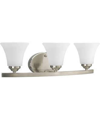 Ideal for a bathroom. Perfect for traditional and transitional style settings. Beautiful brushed nickel finish. Elegant etched glass shades. Mount the light fixture facing up or down. Use 3 medium base bulbs that are sold separately (100 W max - LED/CFL/incandescent). compatible with dimmable bulbs. Measures 21.5-inch width by 6.625-inch height by 7.5-inch (extends from wall). Certifications: UL-CUL Damp Location Listed. Pairs with Joy, Bravo and Trinity collections by Progress Lighting. Our 1-year Limited Warranty guarantees your complete satisfaction with your purchase and includes professional after-sales customer service support.