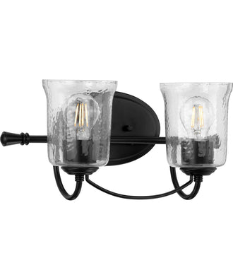Ideal for a bathroom and powder room. Perfect for coastal, farmhouse, rustic, and transitional style settings. Classic matte black finish. Elegant clear chiseled glass shades. Mount the light fixture facing up or down. Use 2 medium base bulbs that are sold separately (60 W max - LED/CFL/incandescent). compatible with dimmable bulbs. Measures 16.375-inch width by 7.75-inch height by 7.375-inch (extends from wall). Certifications: cULus Damp Location Listed. Pairs with the Whisp and Bonn collections by Progress Lighting. Our 1-year Limited Warranty guarantees your complete satisfaction with your purchase and includes professional after-sales customer service support.