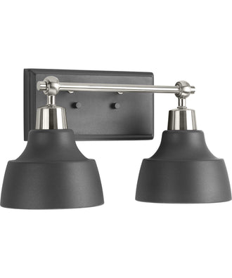Ideal for a bathroom and powder room. Perfect for coastal, farmhouse, and urban industrial style settings. Graphite finish with beautiful brushed nickel accents. Gorgeous graphite metal shades. Mount the light fixture facing up or down. Use 2 medium base bulbs that are sold separately (100 W max - LED/CFL/incandescent). compatible with dimmable bulbs. Measures 15.125-inch width by 8.375-inch height by 7.125-inch (extends from wall). Certifications: cULus Damp Location Listed. Pairs with a variety of lighting fixtures by Progress Lighting. Our 1-year Limited Warranty guarantees your complete satisfaction with your purchase and includes professional after-sales customer service support.