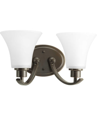Ideal for a bathroom and powder room. Perfect for traditional and transitional style settings. Handsome antique bronze finish. Elegant etched white glass shades. Mount the light fixture facing up or down. Use 2 medium base bulbs that are sold separately (100 W max - LED/CFL/incandescent). compatible with dimmable bulbs. Measures 14-inch width by 7.625-inch height by 8.125-inch (extends from wall). Certifications: UL-CUL Damp Location Listed. Pairs with the Bravo, Tally, and Cherish collections by Progress Lighting. Our 1-year Limited Warranty guarantees your complete satisfaction with your purchase and includes professional after-sales customer service support.
