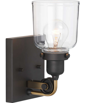 Ideal for a bathroom, dining room, hallway, or foyer. Perfect for farmhouse and urban industrial style settings. Gorgeous graphite finish with antique brass accents. Crisp clear glass shade. Mount the light fixture facing up or down. Use 1 medium base bulb that is sold separately (60 W max - LED/CFL/incandescent). compatible with dimmable bulbs. Measures 5-inch width by 9.5-inch height by 6-inch (extends from wall). Certifications: cULus Damp Location Listed. Pairs with a variety of lighting fixtures by Progress Lighting. Our 1-year Limited Warranty guarantees your complete satisfaction with your purchase and includes professional after-sales customer service support.