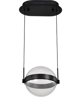 Designed with modern living in mind, the Arvada 62-2031 LED small pendant seamlessly integrates cutting-edge technology with timeless design. The sleek, cable-hung exterior is a canvas of illumination and intricate patterns, with a matte black finish and a perfect sphere of silk screened acrylic housing the light source. The integrated LED lighting not only enhances the visual appeal but also ensures energy efficiency, providing an eco-friendly solution that aligns with your commitment to a sustainable lifestyle. These pendants are the epitome of versatility, from dining rooms to kitchens, and more, the Arvada pendants are designed to captivate, setting the state for ambiance and unforgettable moments.