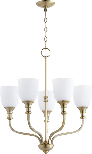 Picture this 5-light Chandelier in your home or office. Refresh your room with this Aged Brass-finished Chandelier by Quorum.