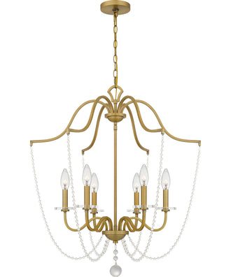 The Sunday 6-light Chandelier in Aged Brass exudes timeless elegance and sophistication. Its traditional style is accentuated by the harmonious blend of aged brass and clear crystal glass beads, creating a stunning visual appeal. The chandelier's design features gracefully curved arms that extend outward, each supporting a candelabra base bulb, adding a touch of classic charm to any space.