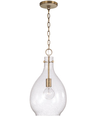 The Brentwood 1-Light Pendant in Aged Brass is a stunning addition to any home, offering a chic blend of curves and simplicity. Its teardrop shape is beautifully accentuated by the clear seeded glass, creating a visually appealing fixture that complements various interior styles. The aged brass finish, with its warm honey-gold hue and subtle black undertones, adds a refined, vintage touch to your space.