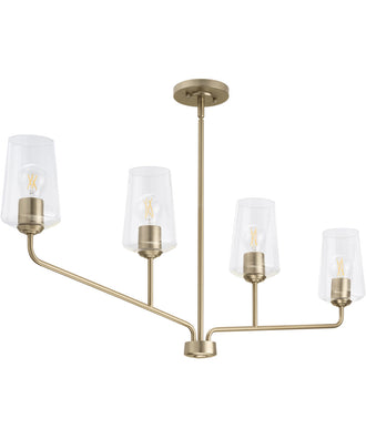 Elevate the elegance of your home with the Celino 4-Light Linear Chandelier in a rich Champagne Bronze finish. This exquisite lighting fixture combines meticulous artistry with timeless design, making it a stunning addition to any room. Inspired by the graceful silhouette of hand-crafted crystal wine glasses, the Celino chandelier features four perfectly proportioned clear glass shades that offer a seamless and visually stunning form. The polished metal arms extend outward, cradling the glass shades with a gentle embrace, creating an inviting ambiance that enhances the sophistication of your space.