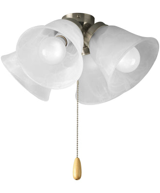Four-light universal fan light kit features alabaster style glass shades beautiful in design. Brushed Nickel finish corresponds with a Chrome pull-chain and maple fob. Universal style for use with fans that accept an accessory light comes with quick-connect wiring. Includes four 3000K, 800 lumen each (source), Title 24 certified LED bulbs.