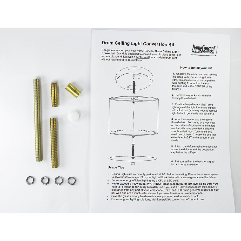 ***This is a kit only. This kit adapts to your existing dome fixture to create a stunning look - without the use of an electrician. Kit includes shade, rod parts, and diffuser. (requires you to have an existing dome light with a center post) The Home Concept Moderne Ceiling Light Cover Converter Kit will turn your dated glass dome light into a stunning, modern drum ceiling light. More than a simple ceiling light cover, this drum ceiling shade is a brand new way to get a stunning look out of those over used ceiling lights. The innovative Moderne ceiling light conversion kit works with existing infrastructure (cost effective), which means no expensive electrician is necessary. All you need to do is remove the ugly glass, and the ceiling light converter kit will connect to your existing center post hardware. Please make sure you have the center post hardware. Will the Moderne Ceiling Light Converter Kit work with your light? AS LONG AS YOU HAVE A THREADED ROD IN THE CENTER OF YOUR EXISTING LIGHT, and the light frame is 12" or narrower. Our kit will attach to this threaded rod, which connects to the shade and diffuser. KEY POINTS: