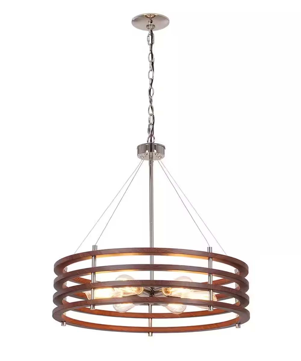 This stunning Catalina 24"W 6-Light Polished Nickel Drum Modern Pendant Mahogany Wood Finish Shade captures the essence of transitional style: beautifully modern features inspired by the timeless elements of traditional design. This hardwired fixture is unique with a 24 in. 4-tier metal shade in beautiful brown mahogany wood finish, suspended from airy, contemporary steel guide wires. Five shiny polished nickel vertical posts connect the wood-trimmed shade, creating a beautiful contrast. The sturdy shade surrounds six standard A19 E26 light bulbs to illuminate brightly (light bulbs not included). Clear or Edison-style light bulbs recommended. This chandelier hangs from a shiny polished nickel canopy and matching adjustable height chain, compatible with sloped ceilings. Dimmable with wall dimmer switch (not included). Brighten and elevate the look of your dining room, living room or entryway with this showstopping fixture.