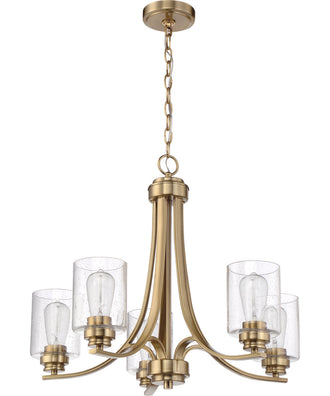 The Bolden 5-Light Chandelier in Satin Brass is a stunning piece that combines bold, clean lines with gentle curves to create an elegant and sophisticated look. The chandelier features a satin brass finish that exudes luxury and warmth, making it a perfect addition to any home decor. The clear seeded glass shades add a touch of vintage charm while complementing the graceful shapes of the chandelier.