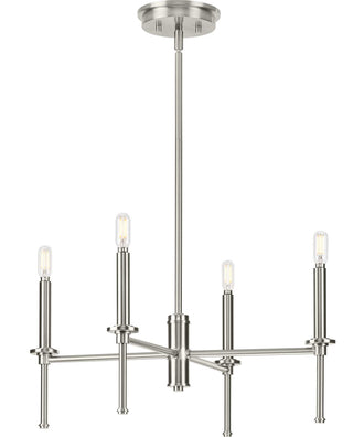 The Elara 4-Light New Traditional Chandelier in Brushed Nickel boasts a clean, contemporary design that seamlessly integrates into various decor styles. Its slender, chic form is accentuated by stylized finials inspired by chess pawns, lending a classically modern look to any space. The brushed nickel finish enhances the chandelier's sophisticated design, making it a perfect fit for new traditional and transitional interiors. The elongated, graceful arms add a touch of elegance while maintaining a modern appeal.
