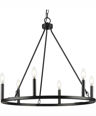 The Gilliam 6-Light New Traditional Chandelier in Matte Black delivers an ethereal quality with its slim circular silhouette. This chandelier's elegant design creates an airy, open feel, making it perfect for a variety of interior styles including new traditional, transitional, and modern farmhouse settings. The round frame, finished in a soft matte black, adds a classic touch to contemporary spaces, ensuring it remains a timeless addition to your home.