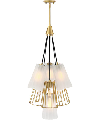 The Liana 7 Light Chandelier in Brushed Gold is a stunning centerpiece that effortlessly combines modern elegance with timeless sophistication. This chandelier features a layered design that incorporates a mix of etched glass and metal cage shades, creating a visually captivating piece. The warm brushed gold finish adds a touch of glamour, making it an ideal addition to any contemporary or classic interior.
