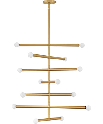 The Millie 14-Light Large Multi Tier chandelier in Lacquered Brass is a stunning centerpiece that embodies the elegance of mid-century modern design. With its elongated cylindrical rods extending outward, this chandelier creates a sleek and sophisticated statement that commands attention in any room. The lacquered brass finish adds a touch of luxury, making it an ideal choice for those looking to elevate their interior decor.