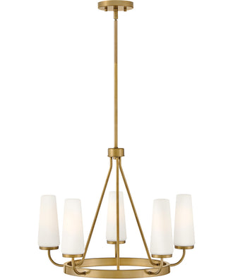 The Selma 5-Light Medium Single Tier in Gold is a captivating blend of transitional design and classic elegance. Its timeless silhouette, enhanced by a luxurious gold finish, makes it a stunning décor accent that seamlessly integrates into modern and sophisticated settings. The chandelier features five tapered, etched opal glass shades that provide a soft, diffused light, creating a warm and inviting atmosphere in any room.