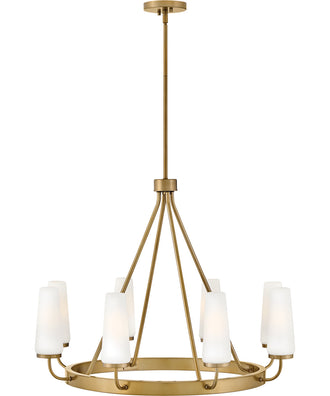 The Selma 8-Light Medium Single Tier chandelier in Gold is a striking blend of transitional design and classic elegance. Its timeless silhouette, accentuated by tapered, etched opal glass shades, brings a sophisticated touch to any room. The luxurious gold finish enhances its modern appeal, making it a stunning décor accent that effortlessly elevates your interior spaces.